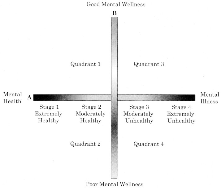 Quadrant 4 – This is the lowest level of functioning. The person has mental illness and also experiences distress.