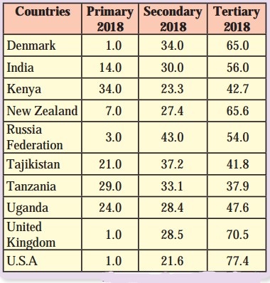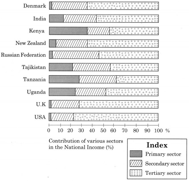 There are four countries – Denmark, Russia, United Kingdom and USA, where less than 5% workers are engaged in primary activities and there are six countries – Denmark, Russia, United Kingdom, USA and India, where more than 50% workers are engaged in tertiary activities.