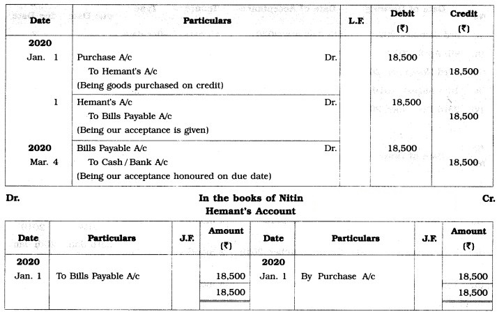 On 1st Jan., 2020 Hemant sold goods of ₹ 18,500 to Nitin. On the same date Hemant drew a bill of exchange for ₹ 18,500 at 2 months. On the due date the bill was duly honoured.