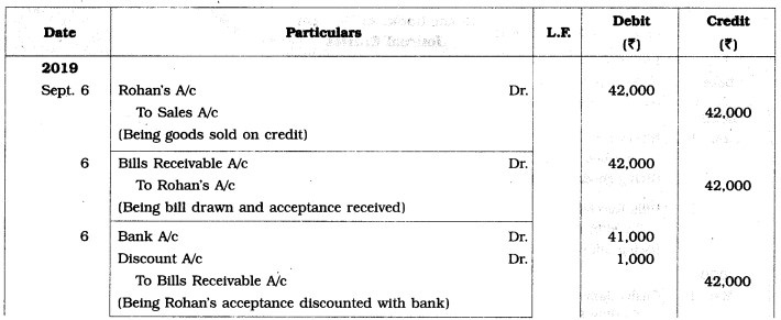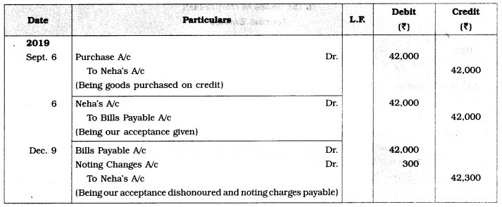 Neha sold goods to Rohan ₹ 42,000 on 6th Sept. 2019. Neha drew a bill of exchange at 3 months for the amount which was accepted by Rohan. Neha discounted the bill with her bankers at ₹ 41,000. On the due date of the bill Rohan dishonoured the bill and bank paid ₹ 300 as Noting Charges.