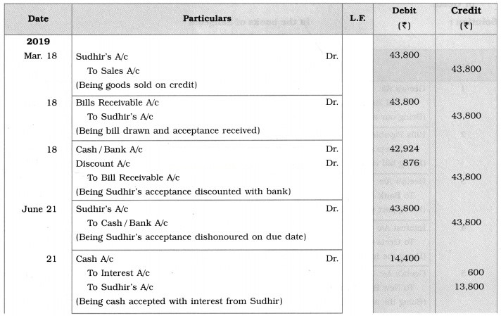 Siddhant sold goods to Sudhir of ₹ 43,800 on 18th March, 2019. Siddhant draws a bill on Sudhir on the same day for ₹ 43,800 for 3 months which was duly accepted by Sudhir. Siddhant discounted the bill on the same day at 8% p.a. The bill was dishonoured on the due date and Sudhir requested Siddhant to accept ₹ 13,800 and interest in cash on remaining amount at 12% p. a. Siddhant agreed and for the balance amount accepted a new bill at 2 months. Before the due date of new bill Sudhir retired the bill by paying ₹ 29,700.