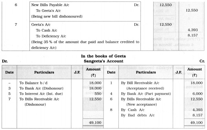 Sangeeta accepted a bill for ₹ 18,000 drawn by Geeta at 3 months. Geeta discounted the bill for ₹ 17,400. Before the due date Sangeeta approached Geeta for renewal of the bill. Geeta agreed on the condition that Sangeeta should pay ₹ 6,000 immediately and for the balance she should accept a new bill for 4 months along with interest ₹ 550. The arrangements were carried through. But on the due date of new bill Sangeeta became insolvent and 35 paise in a rupee could be recovered from her estate.