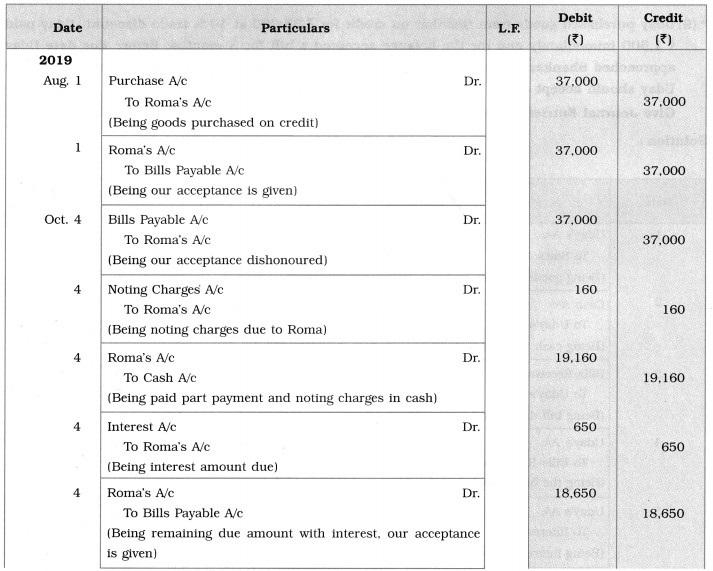 Seema purchased goods from Roma on credit on 1st August, 2019 for ₹ 37,000. Seema accepts bill for 2 months drawn by Roma for the same amount. On the same day, Roma discounts the bill with the bank for ₹ 36,200 on 3rd August, 2019. On the due date the bill is dishonoured and Noting Charges of ₹ 160 is paid by the bank. Seema pays ₹ 19,000 and Noting Charges in cash immediately. A new bill is drawn by Roma for the balance including interest ₹ 650 for 2 months, which is accepted by Seema. The new bill is retired one month before the due date at a rebate of ₹ 300.