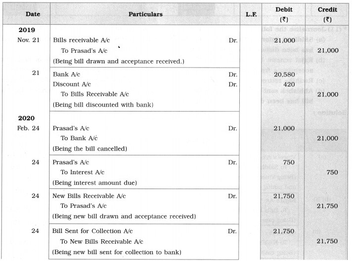 Sagar drawn an after sight bill on 21st Nov., 2019 for ₹ 21,000 at 3 months on Prasad. The bill is discounted by Sagar at 8% p.a. with his bank. On maturity. Prasad finds himself unable to make payment of the bill and requests Sagar to renew it. Sagar accepts the request and draws a new bill at one month for ₹ 21,750 including interest which was duly accepted by Prasad. Sagar deposits the bill into bank for the collection. Prasad honours the bill on the due date and bank charges ₹ 250 as bank charges.