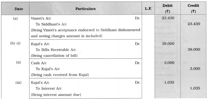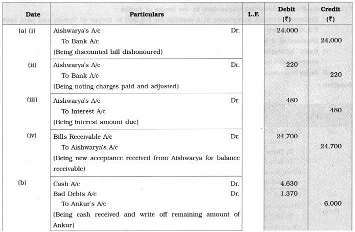 (a) Bank informed that Aishwarya’s acceptance of ₹ 24,000 which was discounted had been dishonoured and bank paid Noting Charges ₹ 220. Bill was renewed at the request of Aishwarya for 2 months with interest of ₹ 480.