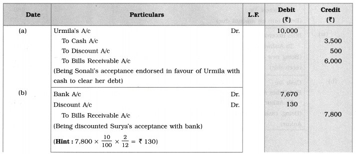 (a) Endorsed Sonali’s acceptance at 2 months for ₹ 6,000 in favour of Urmila and paid cash ₹ 3,500 in full settlement of her account ₹ 10,000.