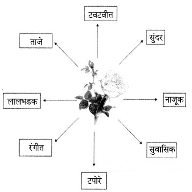 खालील आकृतीत गुलाबाच्या फुलाला आठ विशेषणे लावली आहेत. ती समजून घ्या.