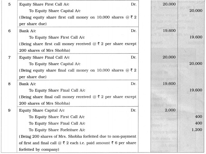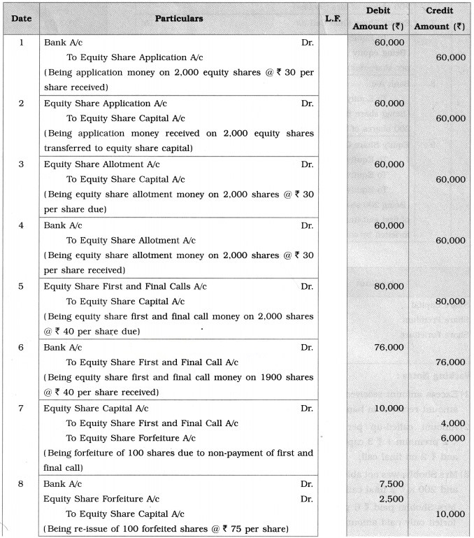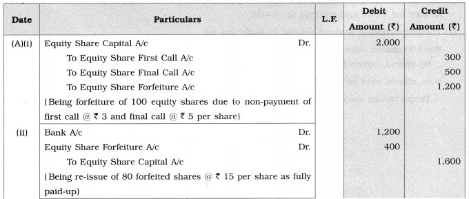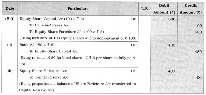 1. Out of 100 forfeited shares, 80 shares were re-issued accordingly Equity Share Capital A/c is debited for ₹ 600 and credited for ₹ 480.