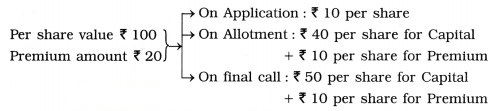 Sucheta Company Limited issued ₹ 20,00,000 new capital divided into ₹ 100 equity shares at a premium of ₹ 20 per share payable as ₹ 10 on Application, ₹ 40 on Allotment and ₹ 10 premium ₹ 50 on Final call and ₹ 10 premium.