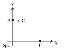 A charge 6 µC is placed at the origin and another charge -5 µC is placed on the y axis at a position A (0, 6.0) m.