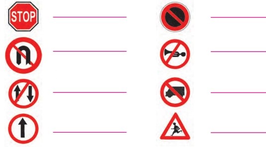 मार्ग पर चलते हुए तुमने कुछ यातायात संकेत देखे होंगे। इन सांकेतिक चिह्नों का क्या अर्थ है, लिखो:
