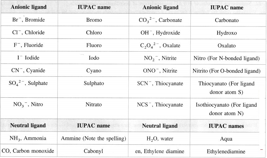 Table 9.1 : IUPAC names of anionic and neutral ligands