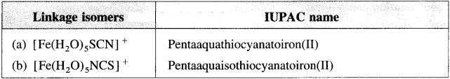 Write linkage isomers of [Fe(H2O)5SCN]+. Write their IUPAC names.