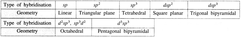 Table 9.3: Type of hybridisation and geometry of a complex