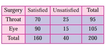 Two hundred patients who had either Eye surgery or Throat surgery were asked whether they were satisfied or unsatisfied regarding the result of their surgery. The following table summarizes their response.