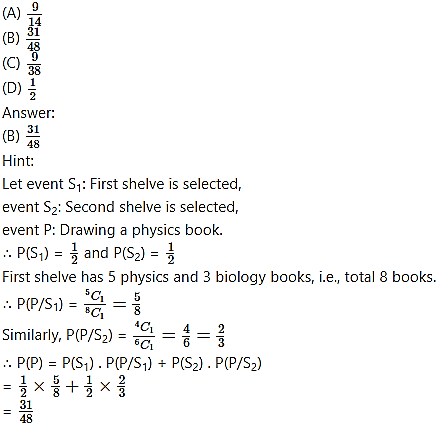 There are 2 shelves. One shelf has 5 Physics and 3 Biology books and the other has 4 Physics and 2 Biology books. The probability of drawing a Physics book is