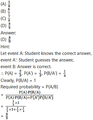 The probability that a student knows the correct answer to a multiple-choice question is 2/3. If the student does not know the answer, then the student guesses the answer. The probability of the guessed answer being correct is 1/4. Given that the student has answered the question correctly, the probability that the student knows the correct answer is