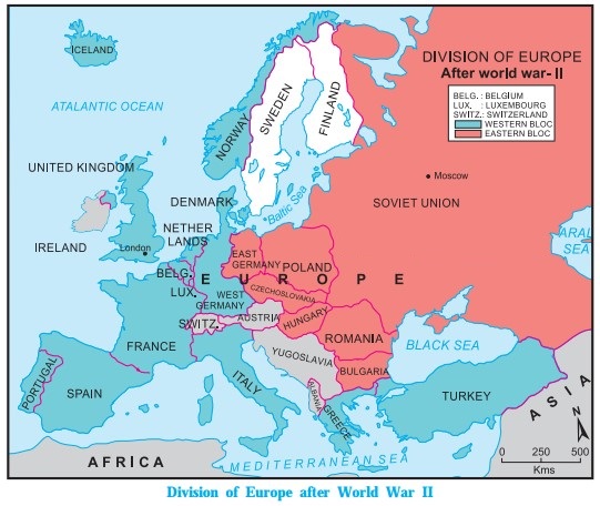(b) Ideological dimension: Eastern Europe adopted Socialist ideology under the influence of the Soviet Union and followed a Socialist form of government. Western Europe adopted capitalist ideology under the leadership of the United States. These countries had democratic governments.