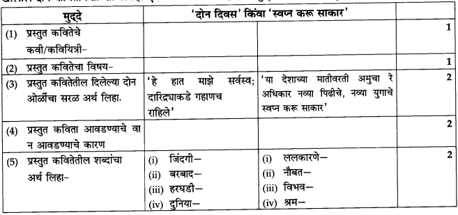 (आ) खालील दोन कवितांपैकी कोणत्याही एका कवितेसंबंधी दिलेल्या मुद्द्यांच्या आधारे कृती सोडवा :
