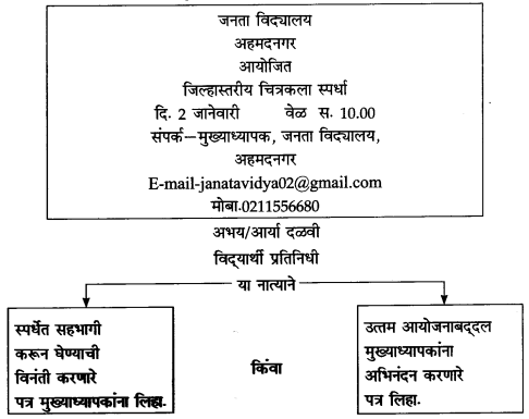 मी अभय जोशी, विद्यार्थी प्रतिनिधी या नात्याने, आपणांस विनंती करू इच्छितो की आपल्या विद्यालयात संपन्न होण्याज्या जिल्हास्तरीय चित्रकला स्पर्धेमध्ये नावे प्रविष्ट करण्यासाठी मी पत्र लिहीत आहे.