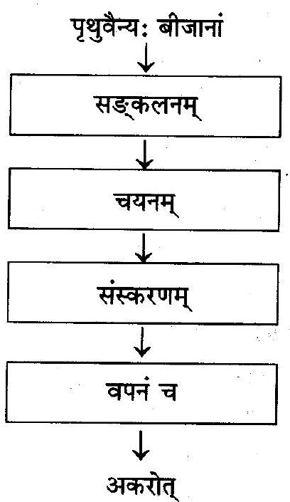 भूमातु: उपदेशं मनसि निधाय पृथुवैन्य: नदीनां मार्गम् अवरुध्य कृषिकार्यार्थं जलस्य उपयोगम् अकरोत्। वृष्टिजलसज्चयं कृत्वा जलव्यवस्थापनम् अकरोत्। भूमिम् उर्वरतमां कर्तुं प्रायतत। तदनन्तरं तस्मिन् क्षेत्रे जनाः धान्यबीजानि अवपन्। स ₹के प्य: वृक्षेप्य: विविधप्रकारकाणां बीजानां सङ्कलनं चयनं च परिश्रमेण अकरोत्। अनन्तर बीजानां संस्करणं कृत्वा वपनम् वम्त्र्। पर्जन्यानन्तरं बीजेभ्य: अड्कुरा: उद्भूताः।